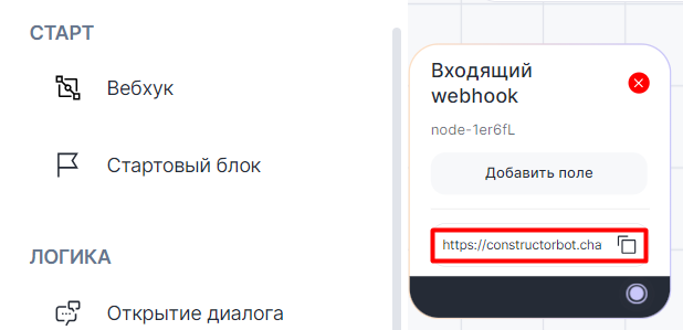 1. В Конструкторе ботов выберите «Вебхук» и добавьте блок на рабочую область.