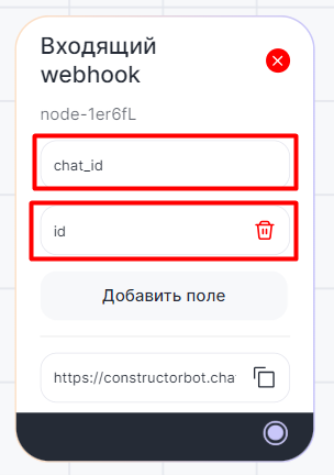 2. Создайте поля и добавьте параметры, которые будут передаваться. Например, создадим два поля chat_id — номер телефона, email или username клиента и id — идентификатор карточки CRM.