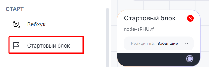 1. В Конструкторе ботов выберите «Стартовый блок» и добавьте на рабочую область.