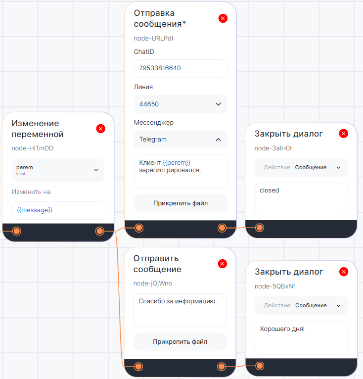 Блок «Отправка сообщения*» в диалоговом сценарии может понадобиться, например, чтобы при регистрации клиента отправить сотруднику в чат уведомление.