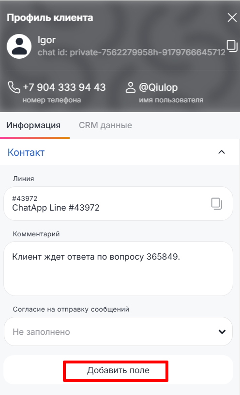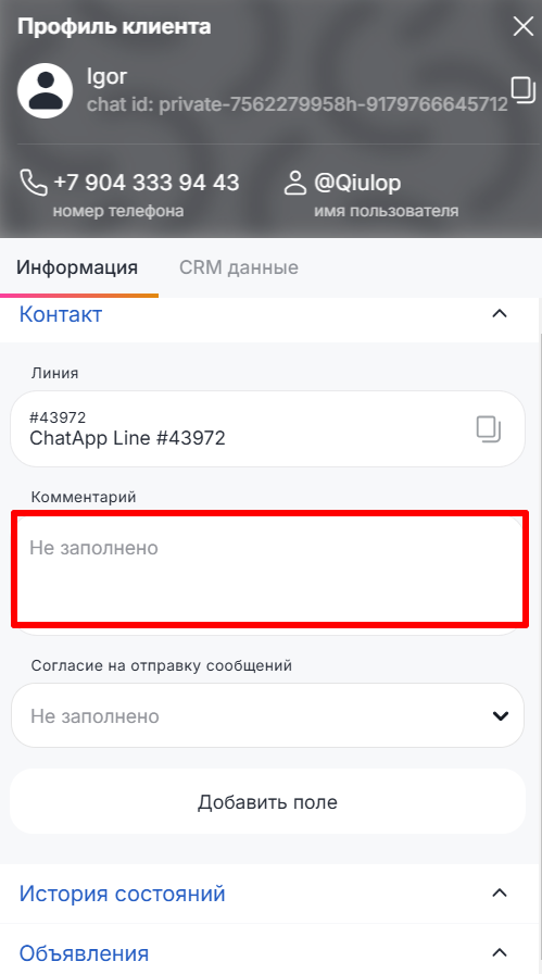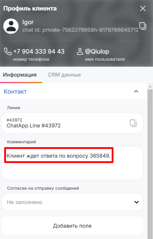 В ChatApp Dialogs можно оставить комментарий к контакту. Это может помочь, например, если вы хотите оставить информацию о клиенте для других операторов.