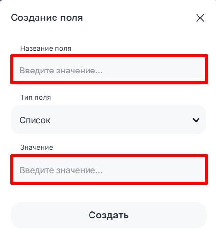• Список — потребуется ввести название списка в «Название поля» и отдельных пунктов в «Значение»;