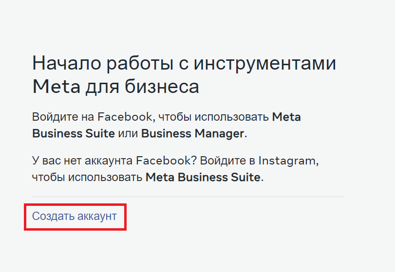 1. Авторизуйтесь в личном аккаунте Facebook*. В этом же браузере, не закрывая личную страницу, перейдите по ссылке Создание аккаунта Facebook Business Manager*