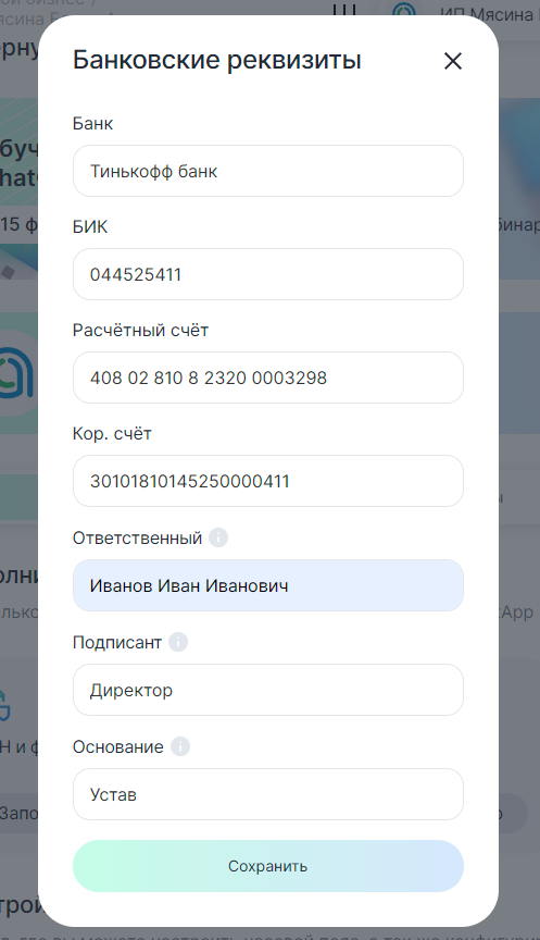 • В «Банковские реквизиты» введите данные расчётного счета.