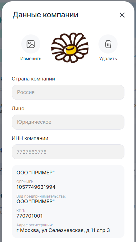 • В «Данные компании» добавьте ИНН и аватар компании для юридического лица.