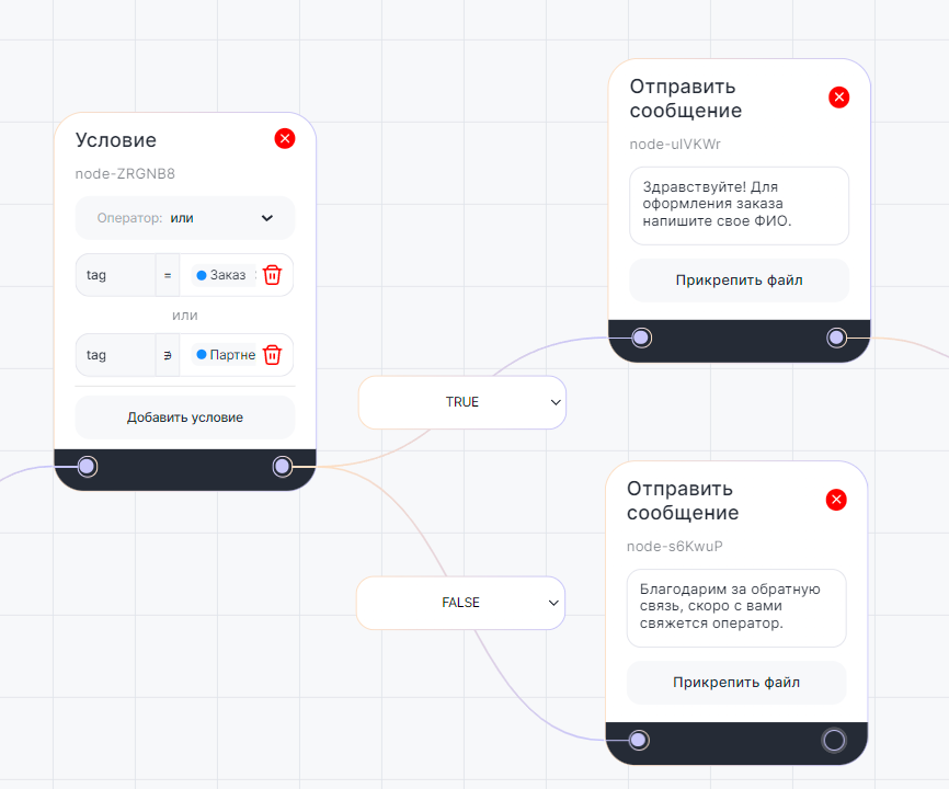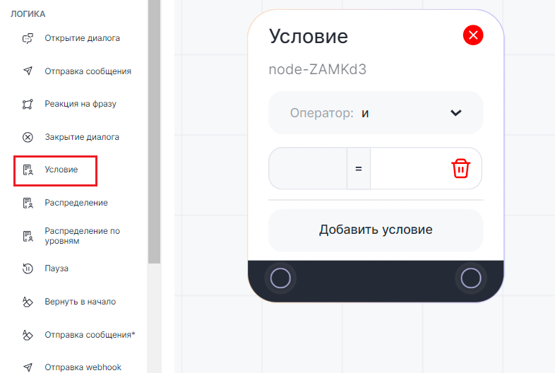 В Конструкторе ботов можно настраивать разные варианты сценария с помощью блока «Условие». Например, создать разные ветки развития сценария в зависимости от условия — для клиентов либо партнеров. Чтобы добавить блок, перейдите в раздел «Логика» — «Условие» и перетащите его в рабочую область.