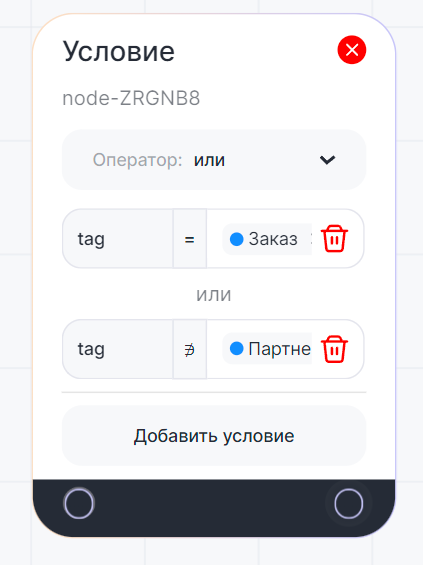 5. В примере сценария ниже контактам с меткой «Заказ» и без метки «Партнер» отправится сообщение для клиентов.
