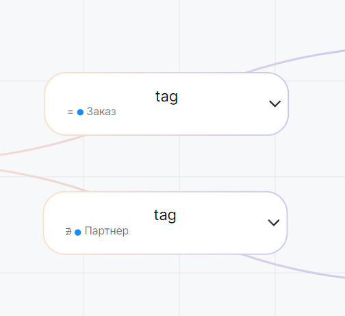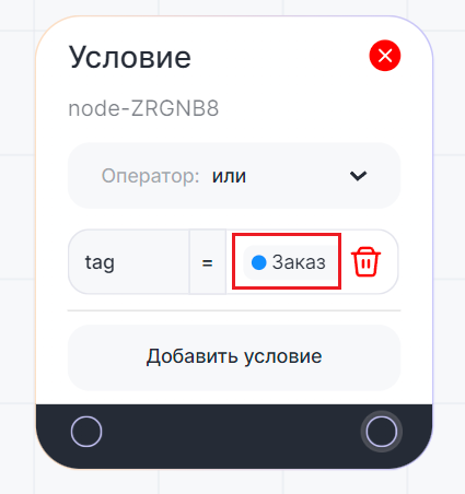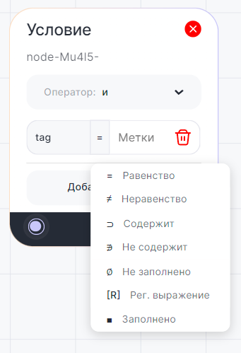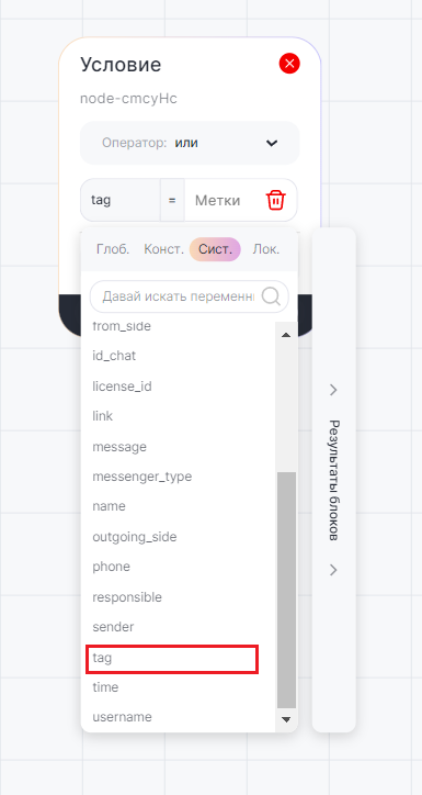 1. Чтобы добавить условие «Метки», выберите в выпадающем списке системных переменных «tag».