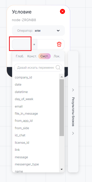 Нажмите в поле слева — автоматически откроется список с разными вариантами системных переменных. Это может быть сообщение, дата, email, день недели, ссылка, метка и т.д.