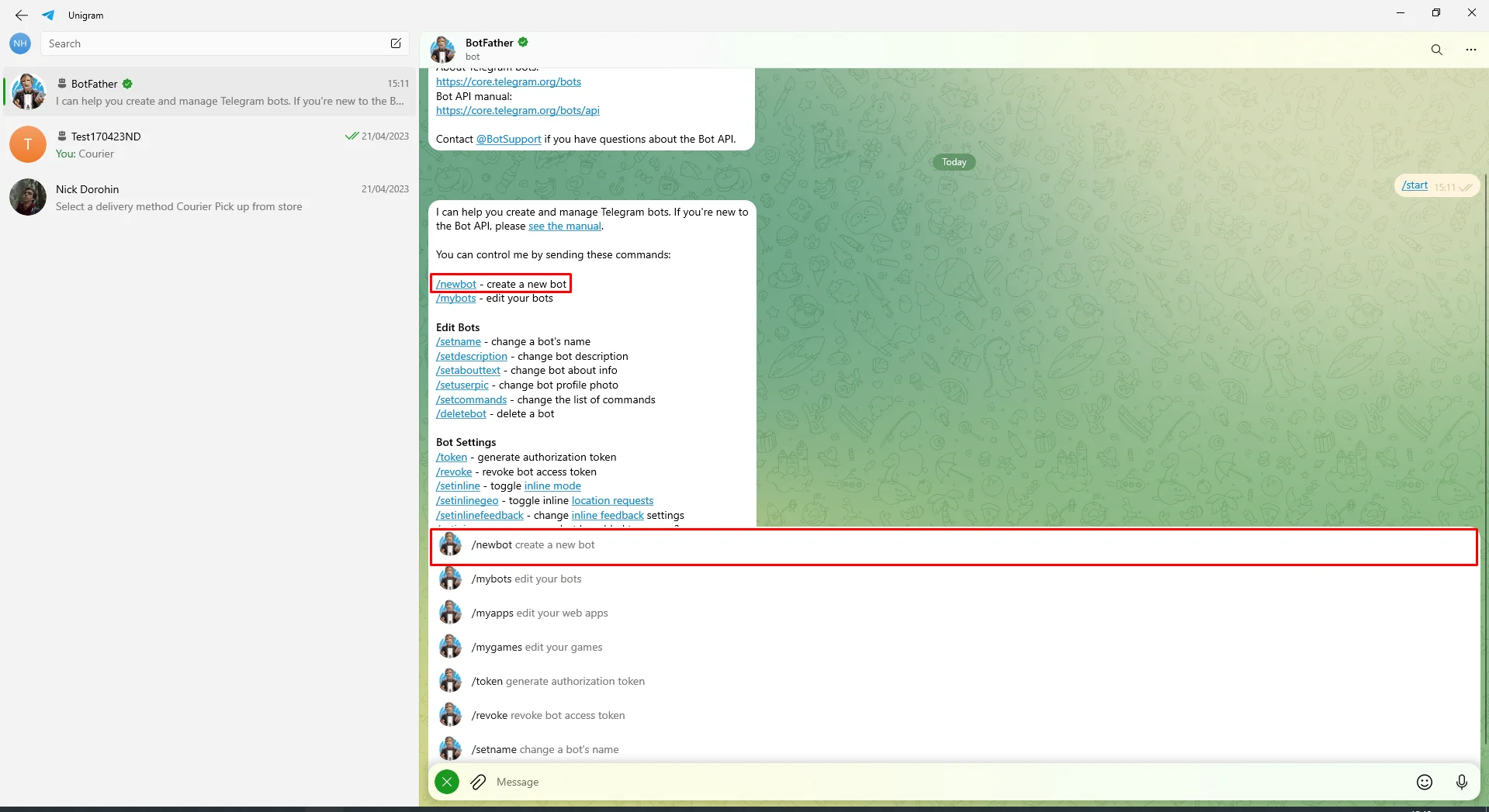 3. Для создания нового бота введите сообщение с текстом /newbot или выберите данный пункт из соответствующего меню;