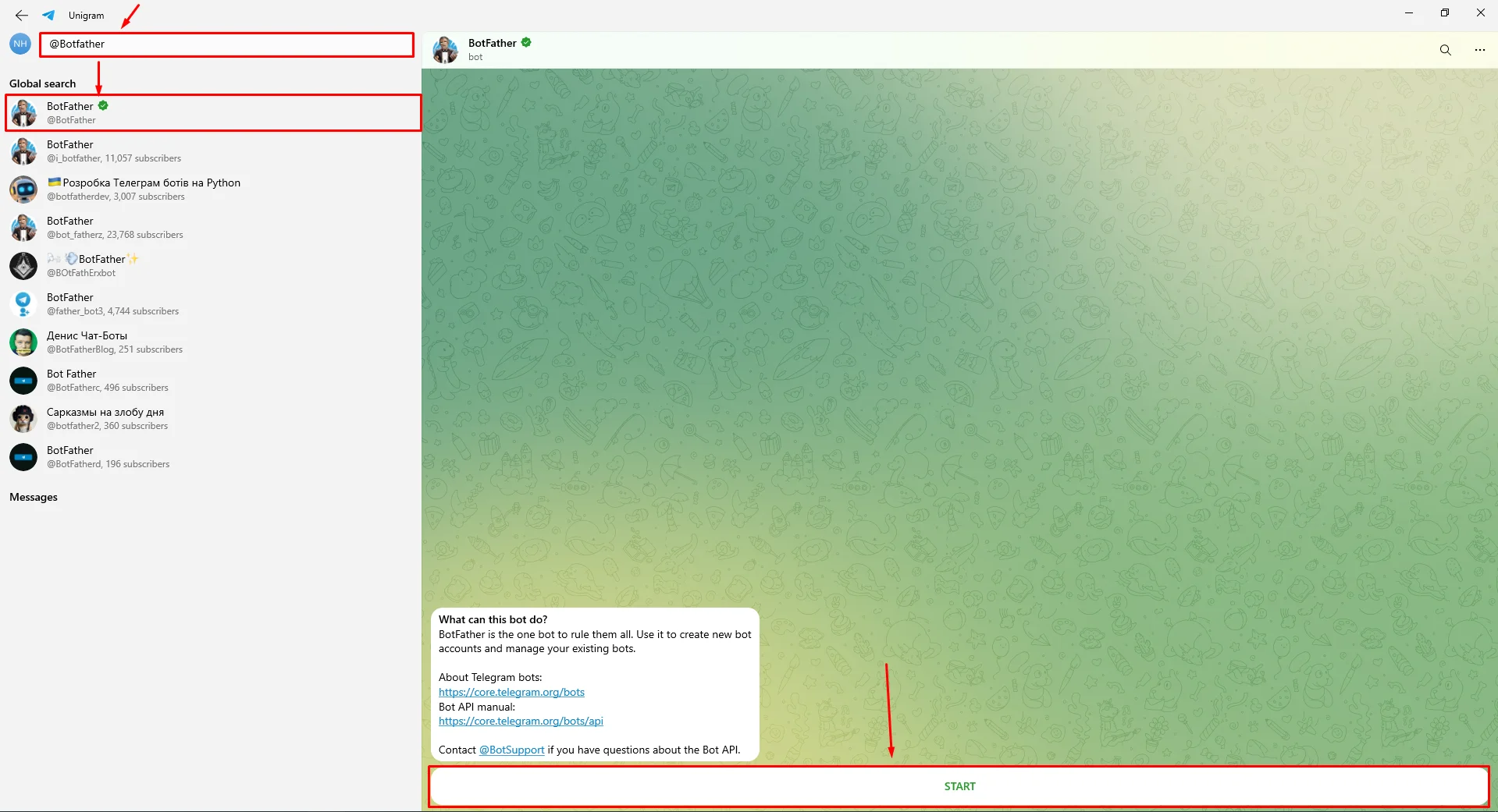 2. В поисковой строке введите имя @BotFather — это универсальный инструмент для создания ботов. После этого нажмите кнопку /Start или /Начать и следуйте дальнейшим инструкциям;