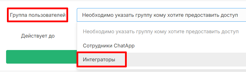 4. В поле «Группа пользователей» выбрать «Интеграторы».
