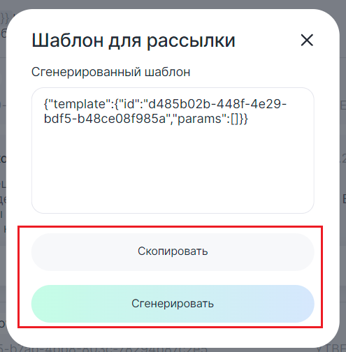 4. В новом окне «Шаблон для рассылки» нажмите «Сгенерировать», а затем «Скопировать» код.