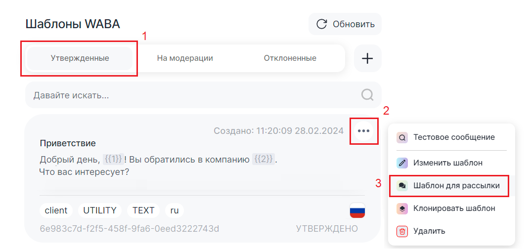 Шаблон WhatsApp business API (WABA) можно скопировать из Личного кабинета ChatApp в разделе шаблонов.