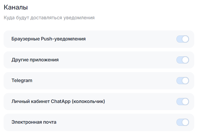3. В разделе «Каналы» можно выбрать, куда будут приходить уведомления.