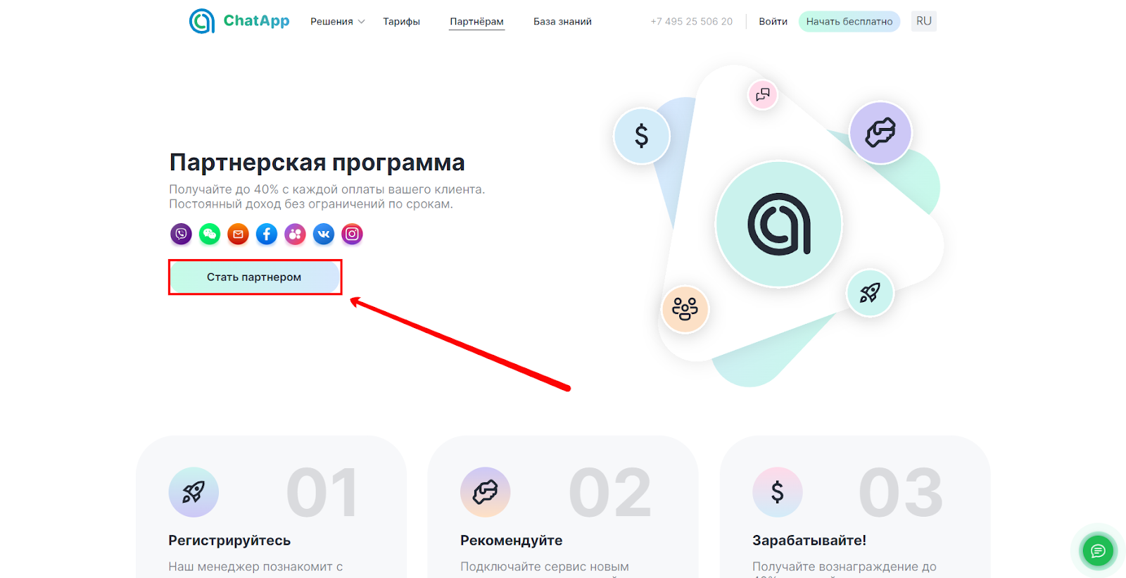 Становитесь партнером компании ChatApp и получайте скидку до 40% на оплату любых продуктов привлеченных клиентов — без ограничений по срокам. Мы предоставляем партнерам обучение, сопровождение и личный кабинет с инструментами для продвижения и анализа работы.