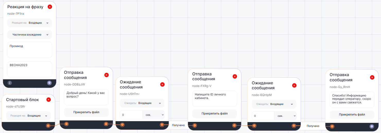 Например, в сценарии диалога с ботом, клиент может в любой момент написать «Промокод» и получить в ответ «ВЕСНА2023».
