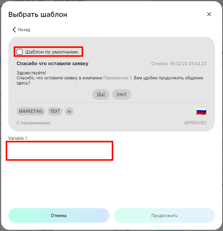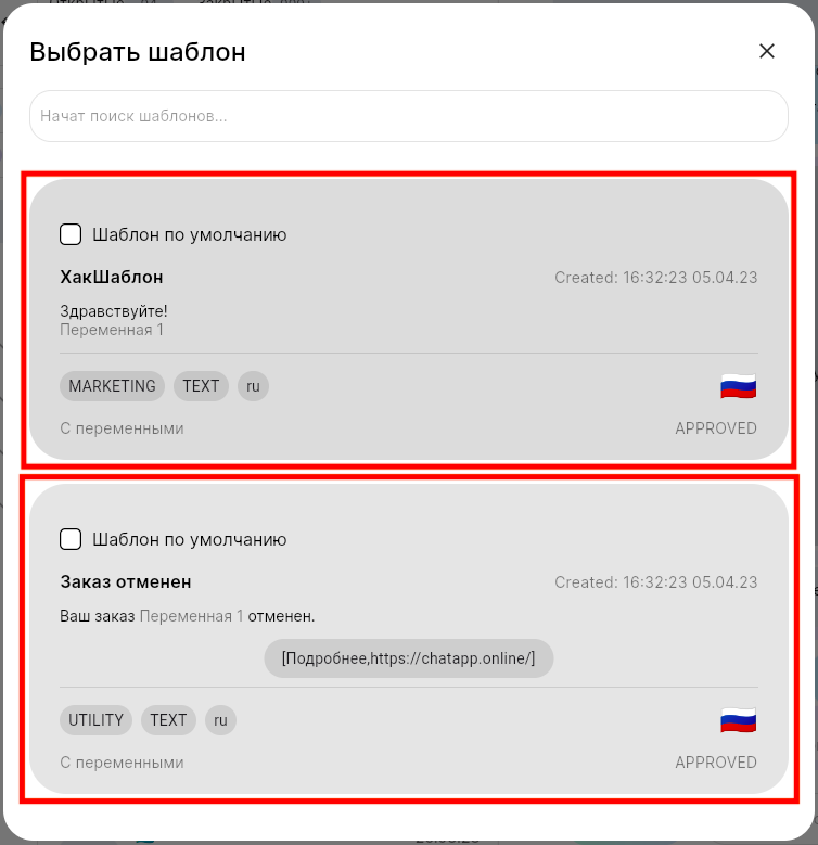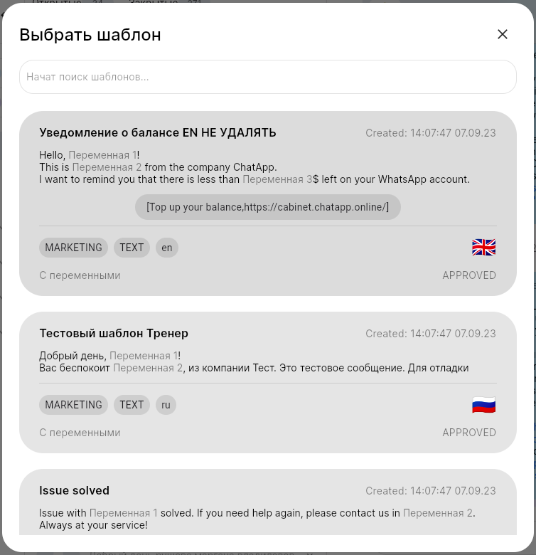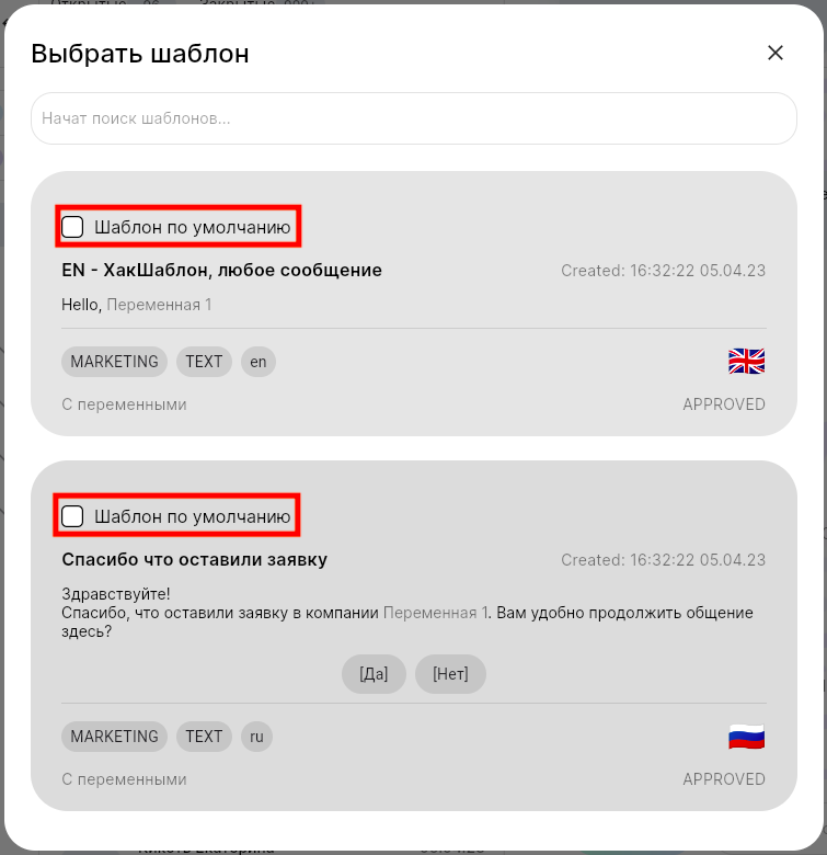 Обратите внимание, шаблоны по умолчанию, также как и выбор шаблонов из списка, доступны только в диалогах с пользователями WhatsApp Business API (GupShup).