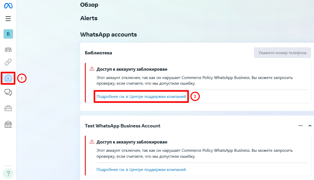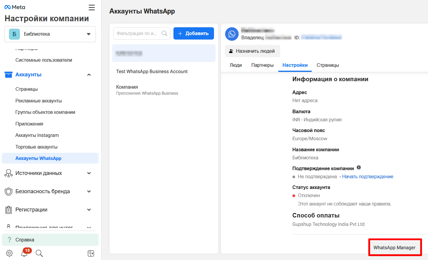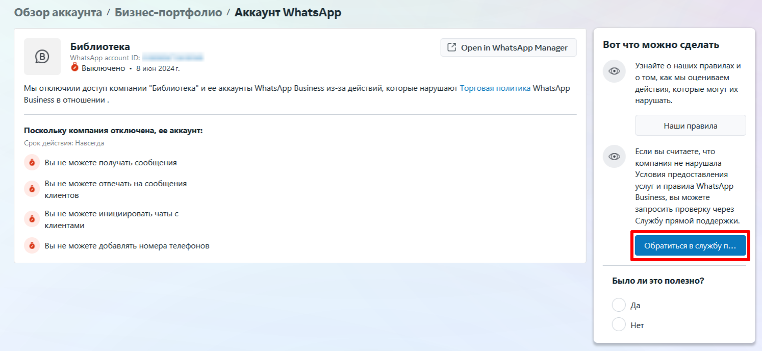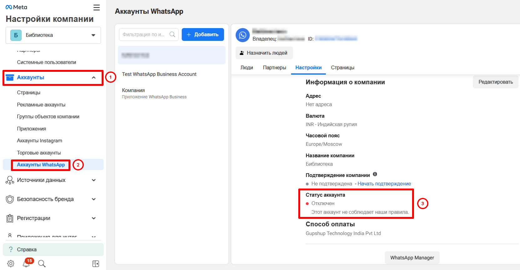 Если аккаунт заблокирован, в настройках компании в разделе «Аккаунты» — «Аккаунты WhatsApp» — «Имя аккаунта» — «Статус аккаунта» будет «Отключен».