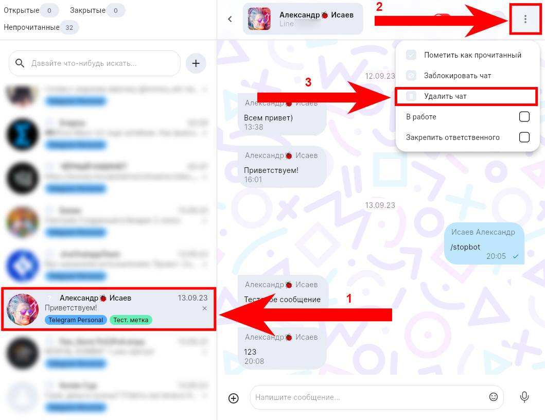 6. Выберите диалог. Нажмите на в правом верхнем углу. Нажмите «Удалить чат».