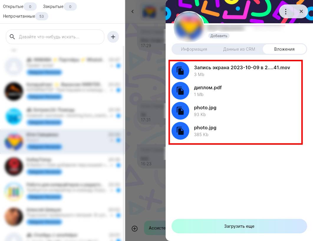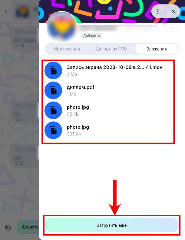 5. Чтобы увидеть более старые вложения из диалога, нажмите «Загрузить еще».