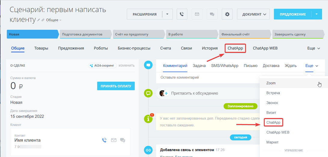 2. В карточке сделки нажмите на номер телефона клиента и выберите канал связи.