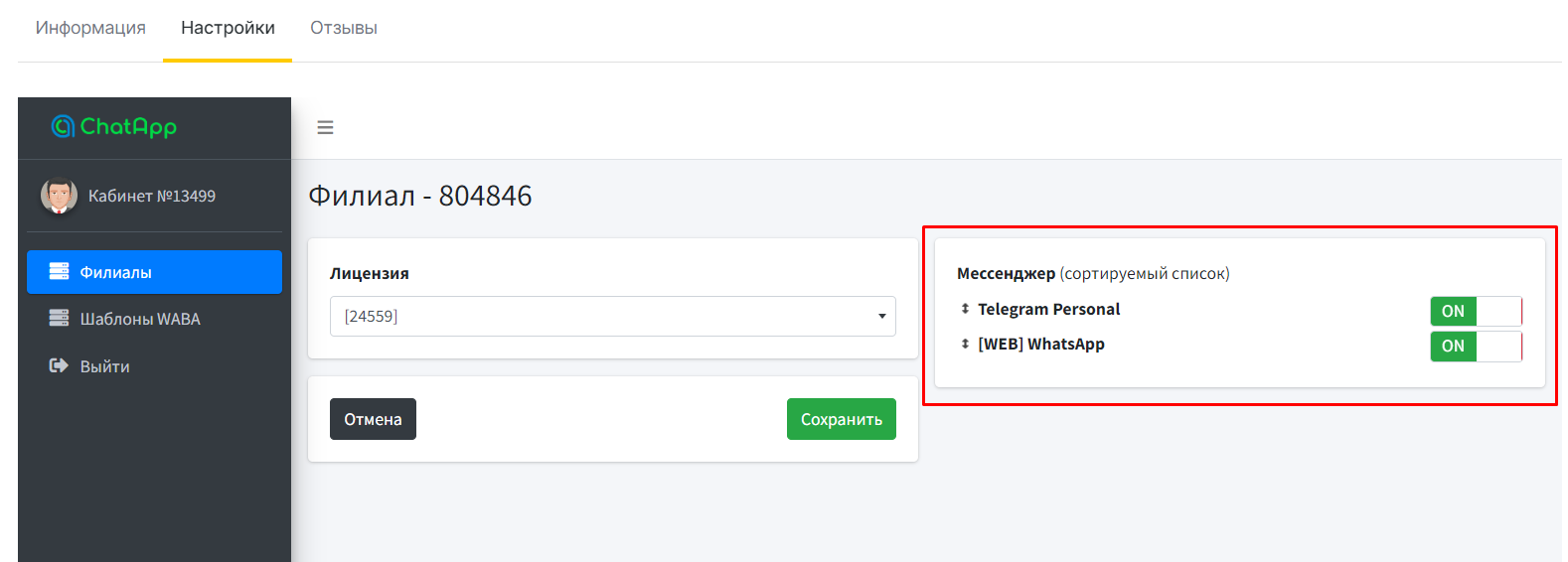 В настройках интеграции ChatApp можно изменить приоритетный мессенджер для отправки сообщений. Первый в списке