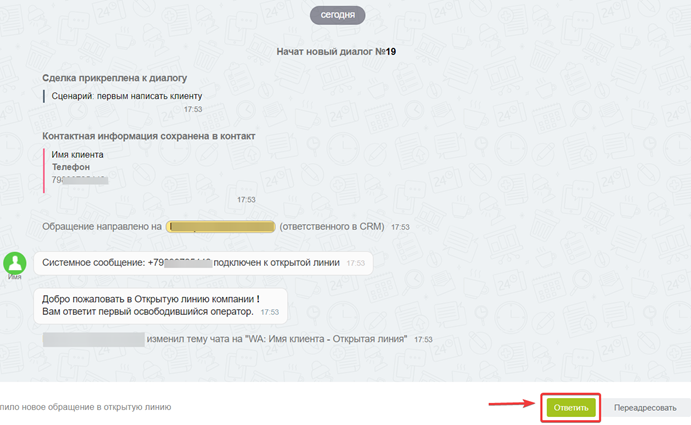 2. Нажмите на иконку WhatsApp или Telegram. Можно открыть диалог с клиентом