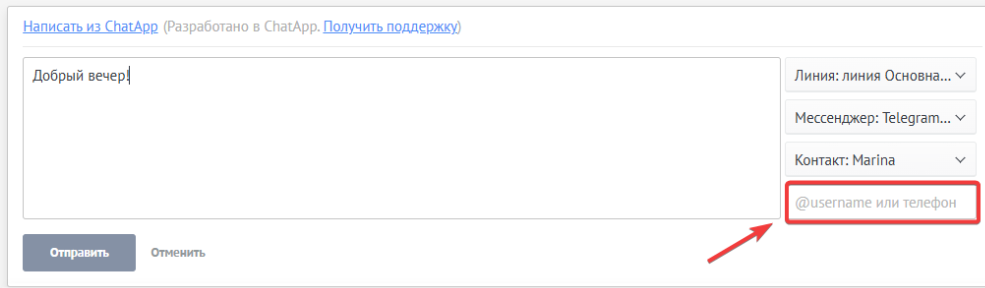 2. В меню отправки сообщения заполните поле «Username или телефон».