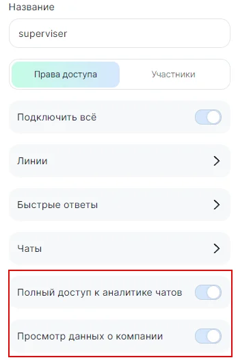 Поставьте ползунки как указано на скриншоте, чтобы сотрудник видел аналитику чатов и данные о компании.