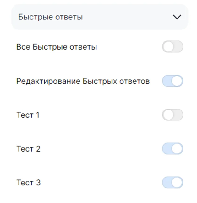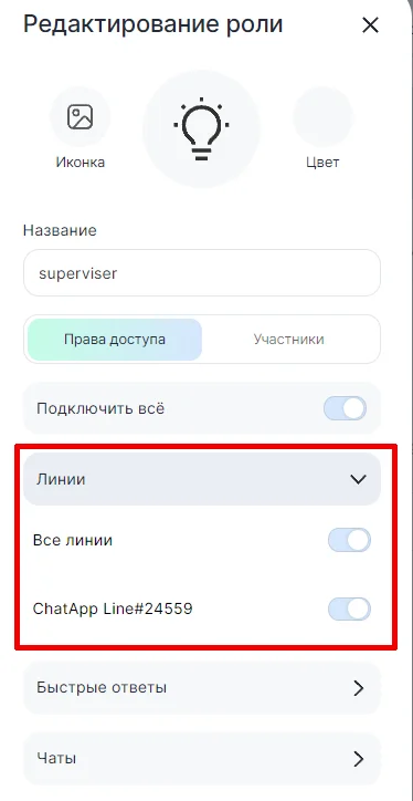В Личном кабинете можно изменять разрешения для сотрудников: доступ к просмотру и редактированию чатов, аналитике.