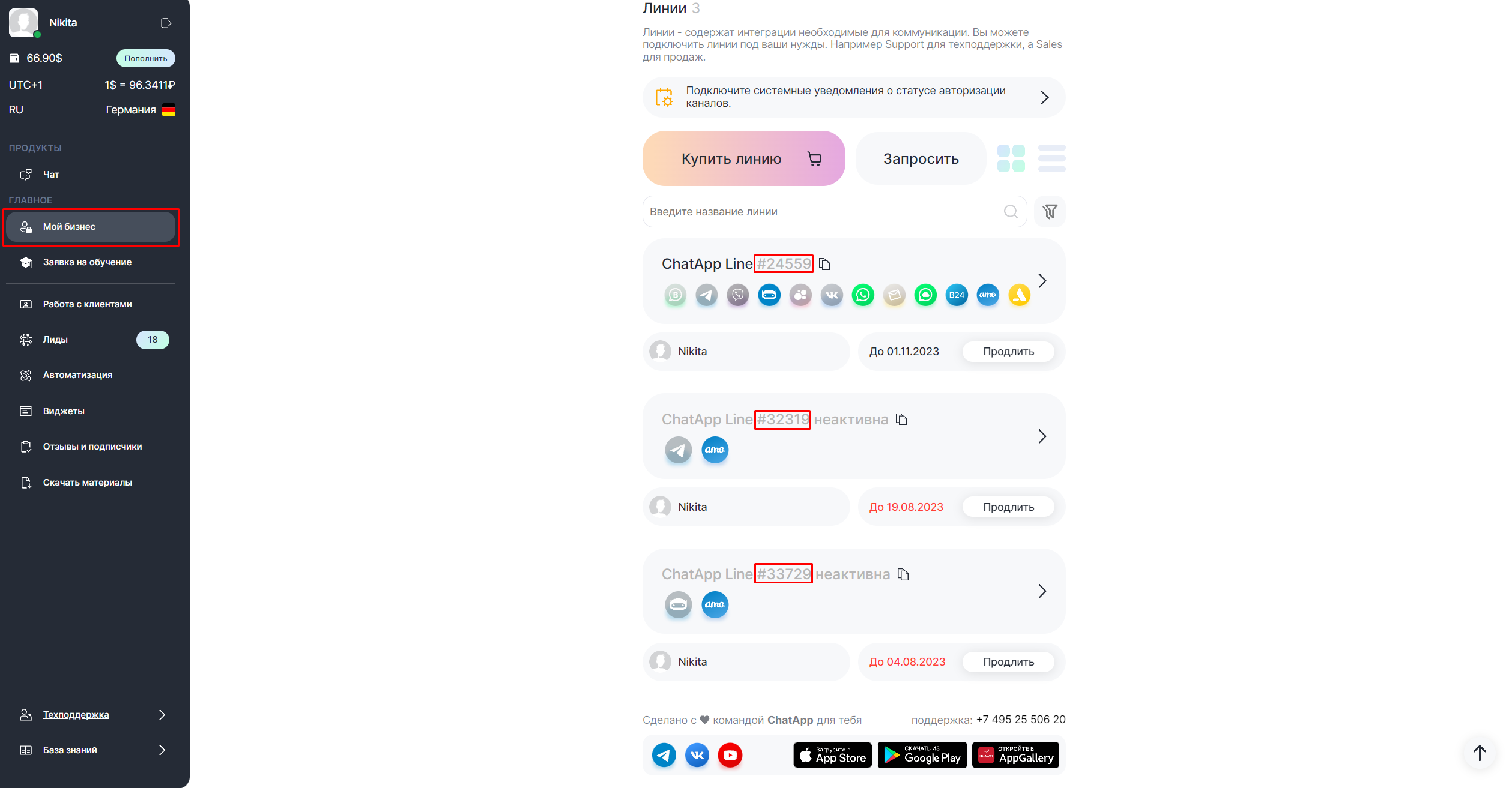 ID линии можно узнать в списке линий в разделе «Выбранная компания».