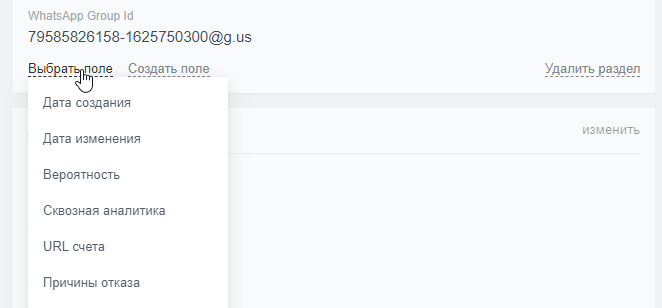 Для отображения поля WhatsApp Group id, нужно в карточке сделки выбрать это поле из списка