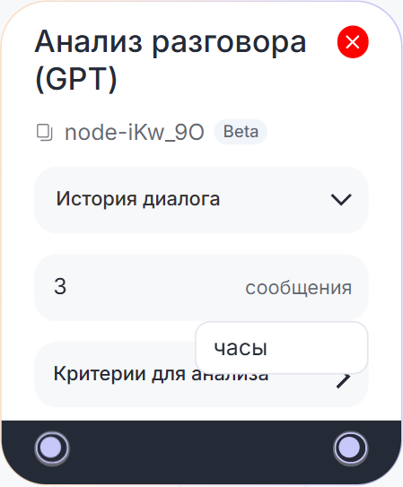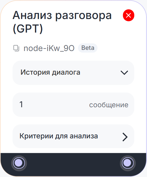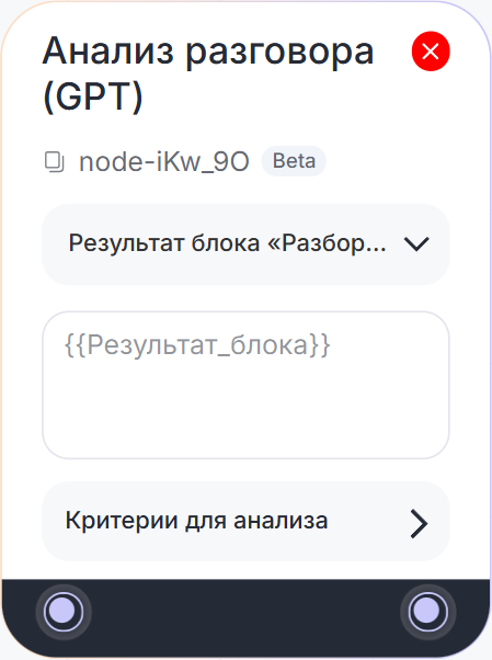 Блок «Анализ разговора (GPT)» анализирует голосовые файлы или переписку с помощью ChatGPT, проверяет на соответствие заданным критериям и передает результат. Может понадобиться, например, чтобы оценивать диалоги менеджеров с клиентами. Блок может разобрать историю диалога или использовать результаты блока «Разбор голосового файла (GPT)».