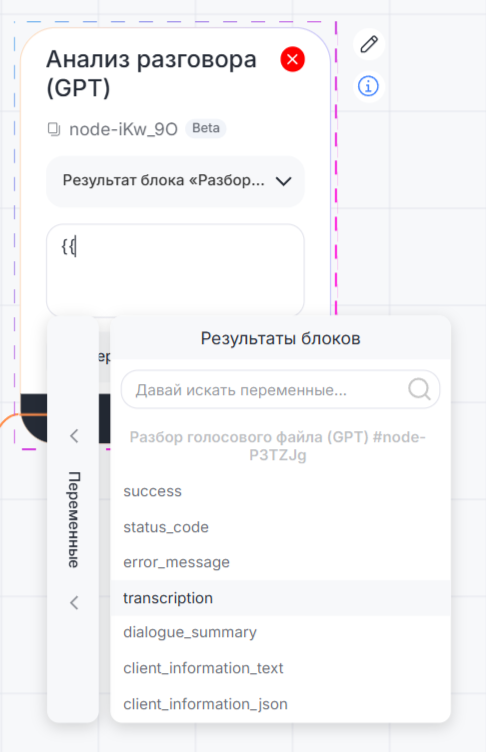 Введите результат блока «Разбор голосового файла» в текстовое поле. Для этого введите две фигурные скобки «{{», выберите «Результаты блоков» — «Разбор голосового файла (GPT)» — «transcription».
