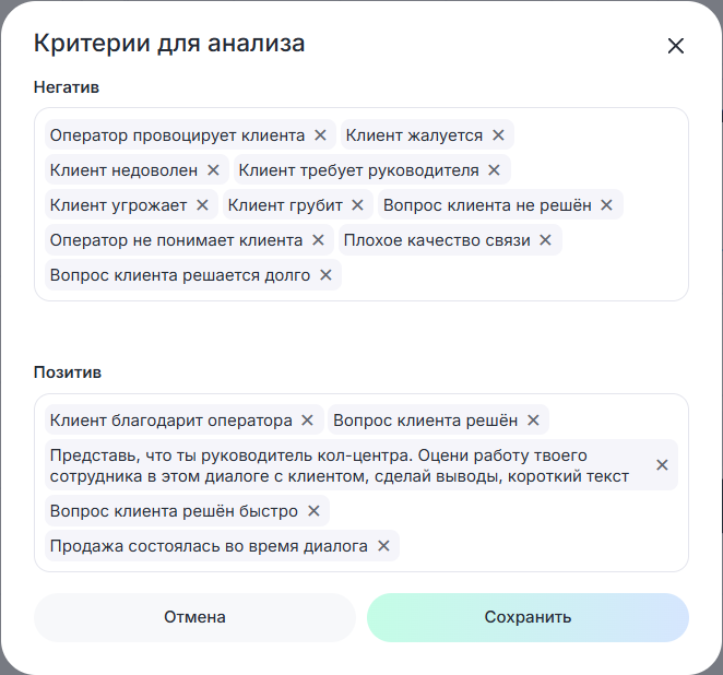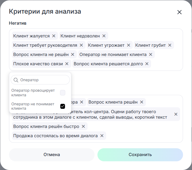 4. Чтобы указать список критериев, которые будет анализировать блок, нажмите «Критерии для анализа». Параметры делятся на «Негатив» и «Позитив».