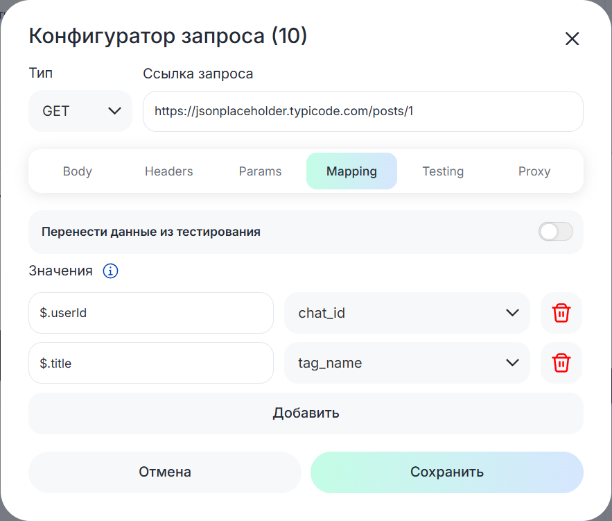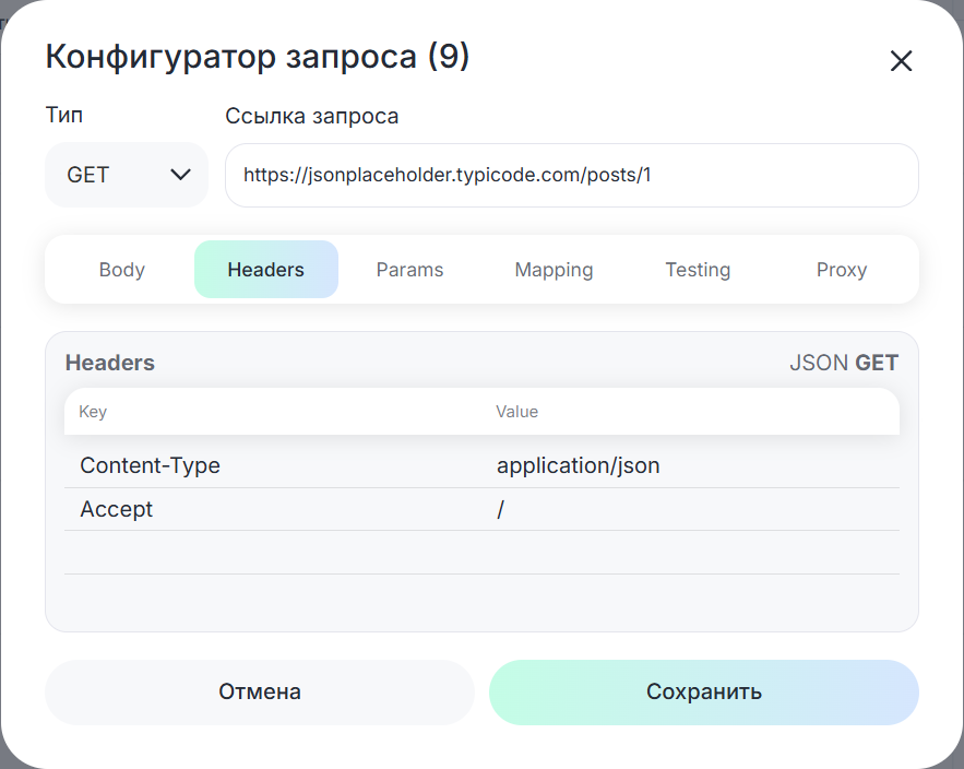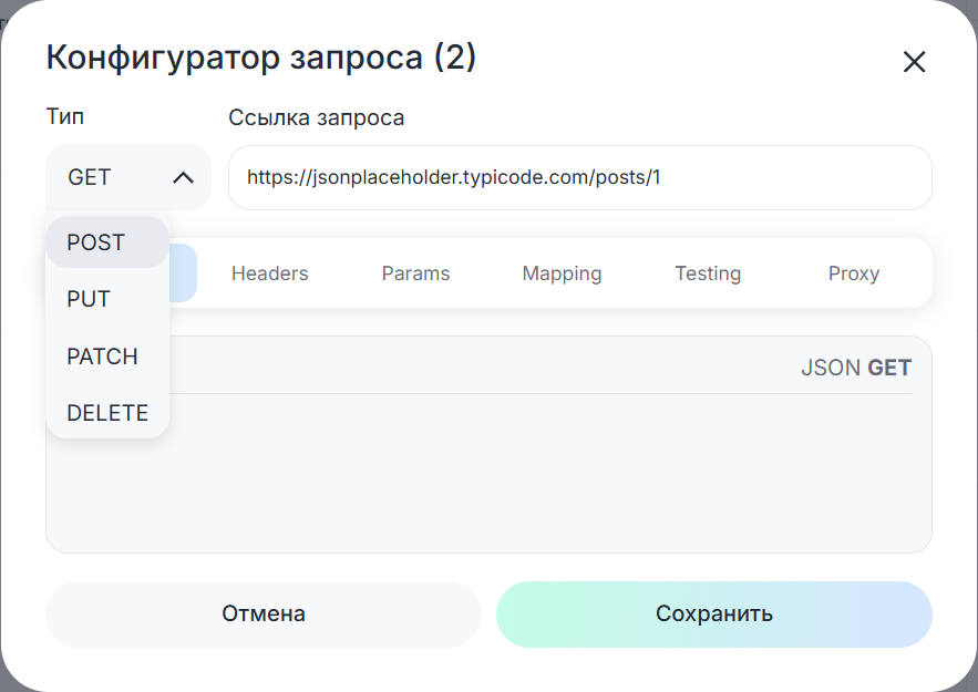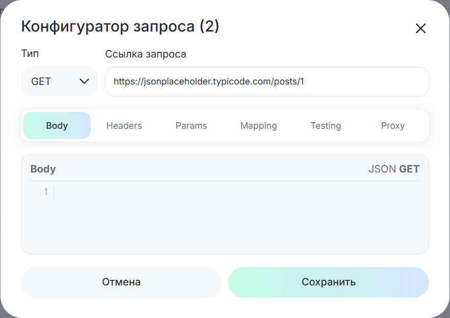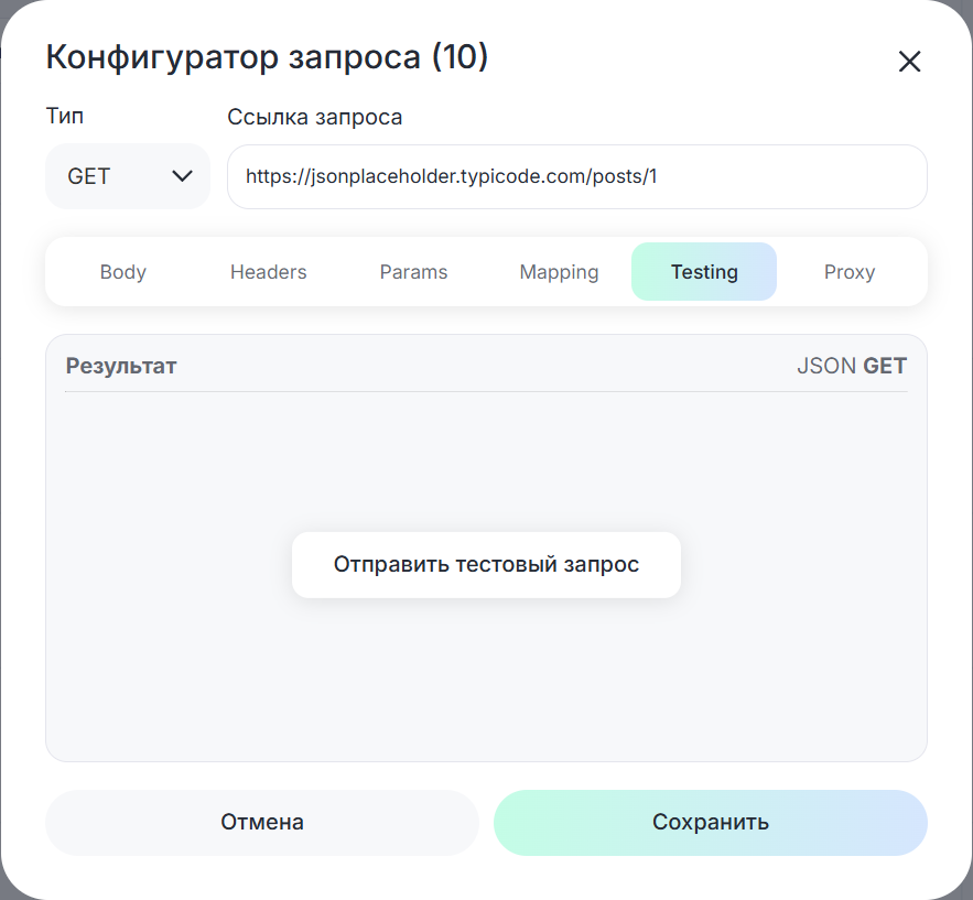 1. Укажите адрес сервиса в поле «Ссылка запроса».