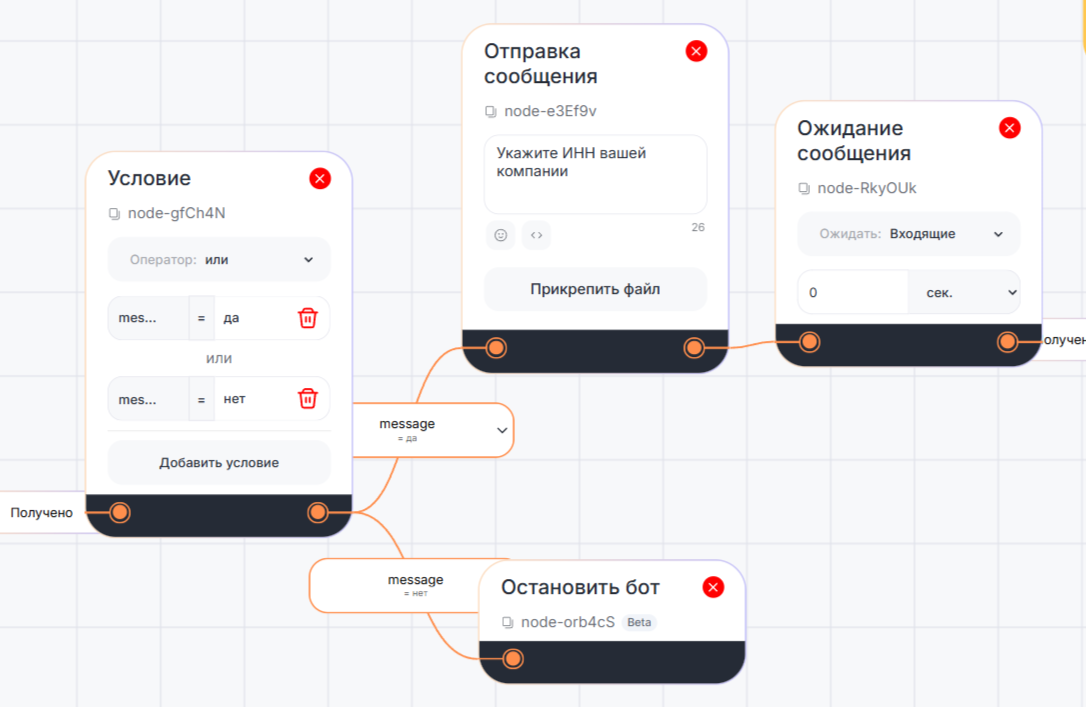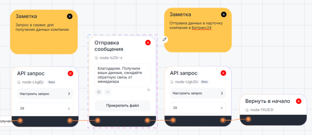 Блок может понадобиться, например, для отдела продаж — бот в диалоге с клиентом запросит ИНН компании, блок «API запрос» отправит результат в сервис автоматической проверки реквизитов компании и внесет данные в карточку компании Битрикс24.