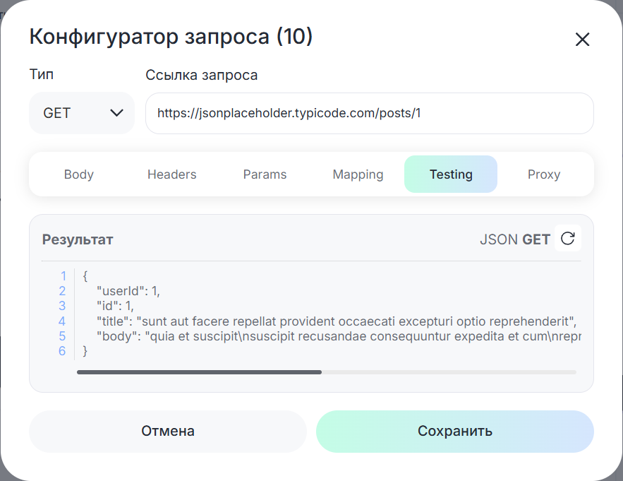 Ответ сервера в формате JSON отобразится в поле «Результат».