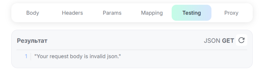Если в теле запроса допущена ошибка, система отобразит сообщение: Your request body is invalid json