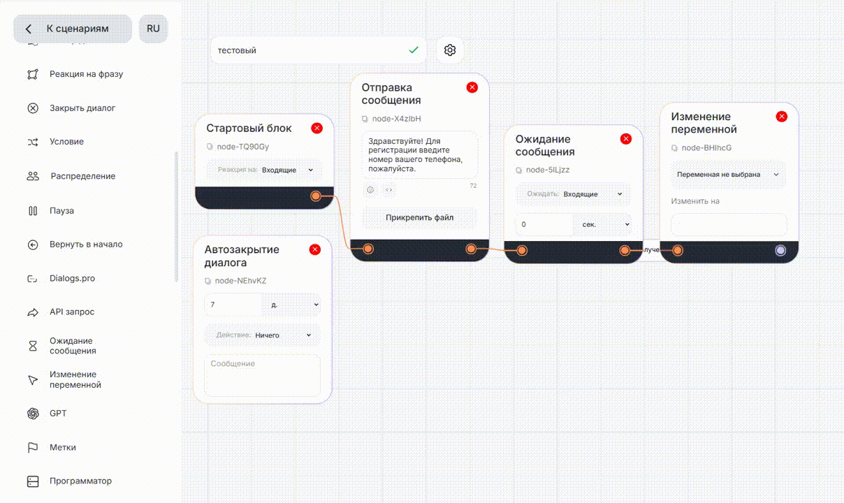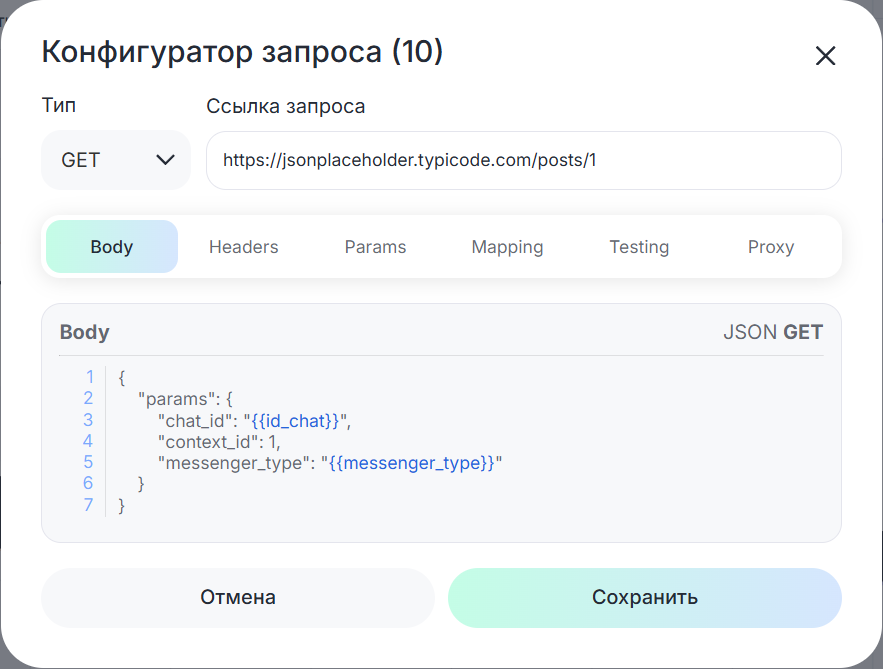 Блок «API запрос» отправляет HTTP-запрос в формате JSON на внешний сервис и получает ответ. Полученные данные можно записать в переменные и использовать их в сценарии.