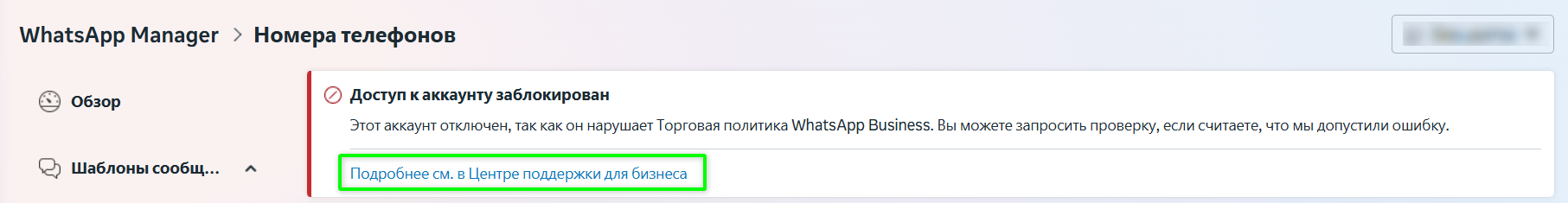 Перейдите в WhatsApp Manager и нажмите на значок «Подробнее см. в Центре поддержки для бизнеса».