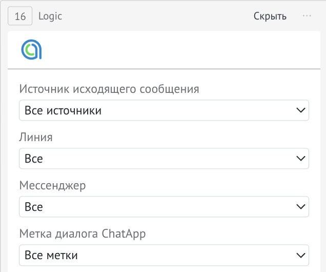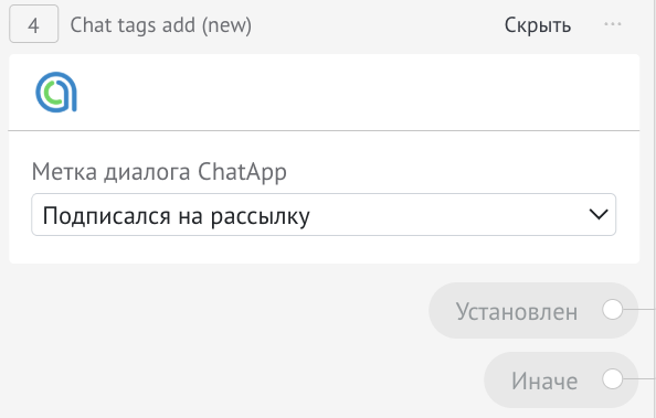 В поле «Метка диалога ChatApp» — из выпадающего списка выберите метку которую нужно присваивать к диалогу.