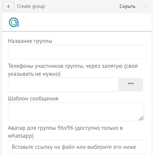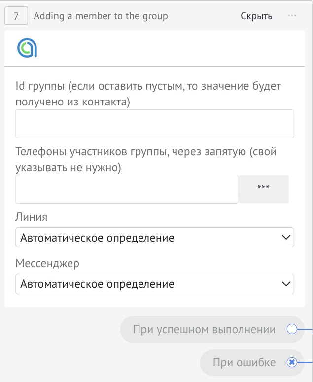 В поле «ID группы» — оставьте поле пустым, если нужно добавлять участника в группу из карточки сделки. Если нужно всегда добавлять в одну и ту же группу — укажите ID группы из Scenario Dialogs.