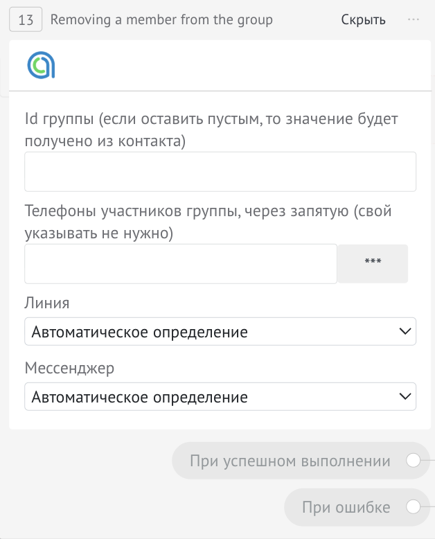 В поле «ID группы» — оставьте поле пустым, если нужно удалить участника из группы карточки сделки. Если нужно всегда удалять участников из одной и той же группы — укажите ID группы из Scenario Dialogs.