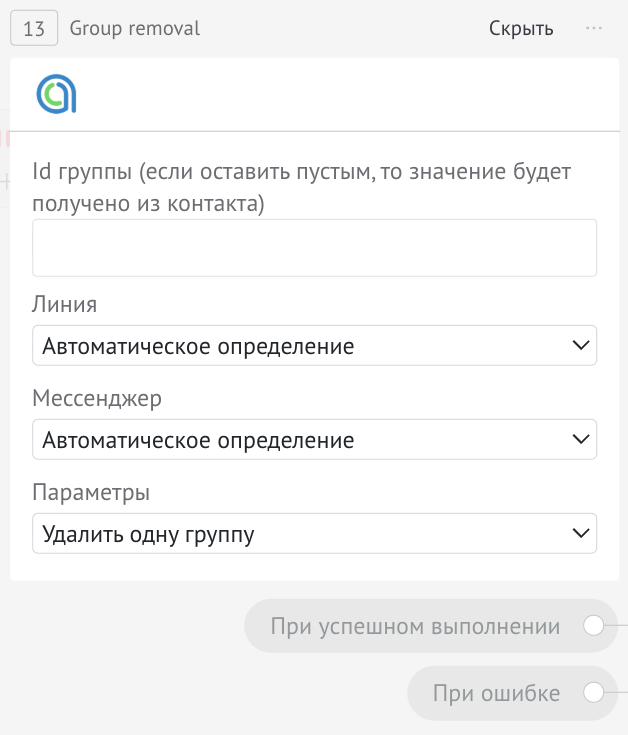 В поле «ID группы» — оставьте поле пустым, если нужно удалить группу из карточки сделки. Если нужно удалить конкретную группу — укажите ID группы из Scenario Dialogs.