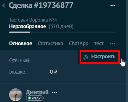 Шаг 1. В воронке нажмите «Настроить» → выберите стадию, где запускать SalesBot.