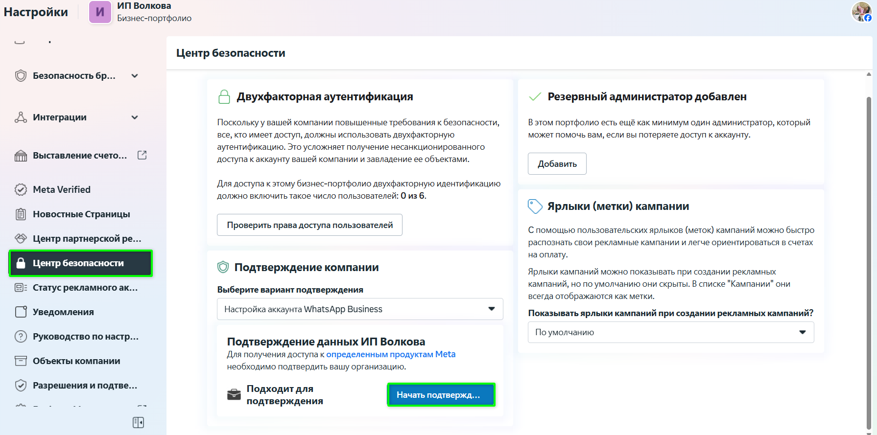 Подтверждение позволяет Meta убедиться, что бизнес-портфолио принадлежит официально зарегистрированной компании или организации.