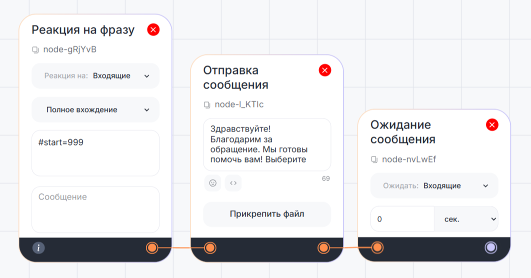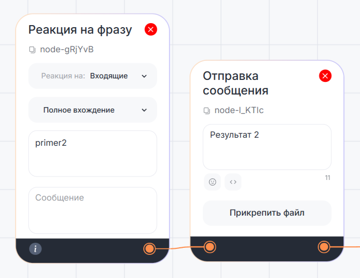 Когда клиент перейдет по глубокой ссылке, блок «Реакция на фразу» получит ключ «primer2». Клиент запустит диалог с Telegram Bot и чат-бот автоматически отправит сообщение из сценария.