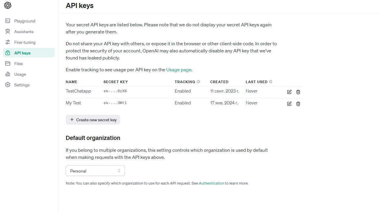 2. Перейдите в раздел «API Keys» и нажмите «Create new secret key».